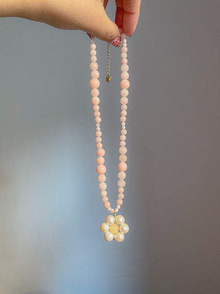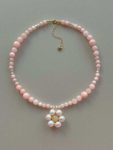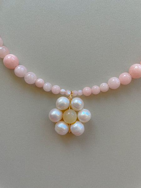 This chunky necklace features a handmade daisy pendant featuring freshwater pearls. The necklace is made with varying sizes of bubblegum jade and pink mother of pearl.