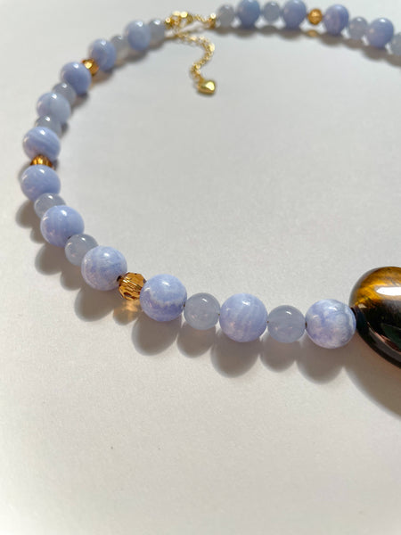 This one of a kind chunky necklace features a tiger’s eye heart pendant, blue crazy lace agate, blue jade, and brown glass crystals.