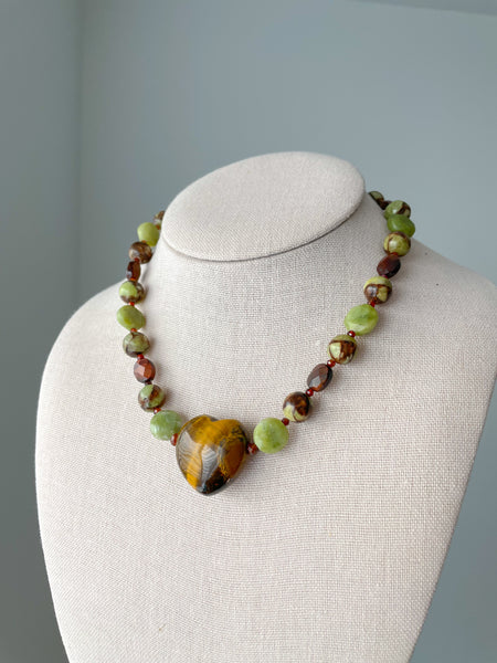 This one of a kind chunky necklace features a tiger’s eye heart pendant, bronzite peridot, red tiger’s eye, hessonite, and green jade