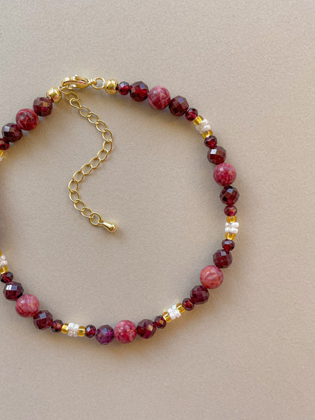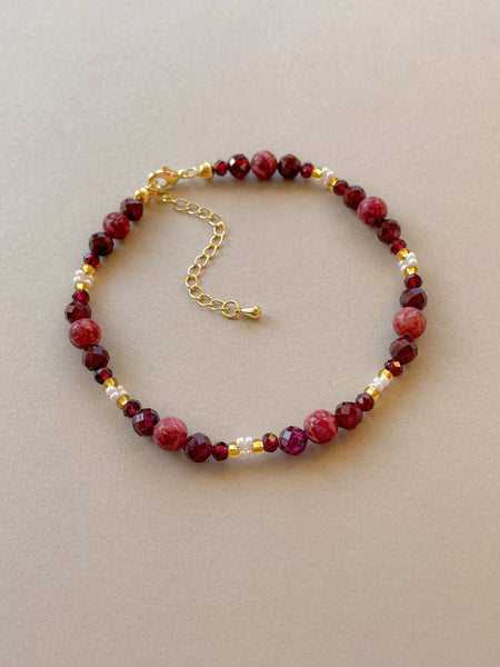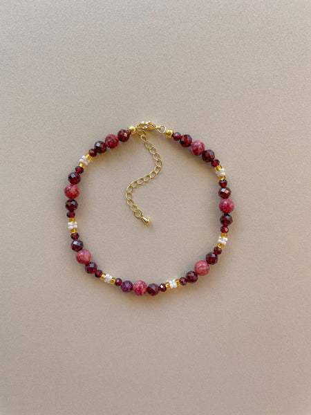 This anklet features garnet stones and white beaded accents to represent snowdrop flowers for the month of January