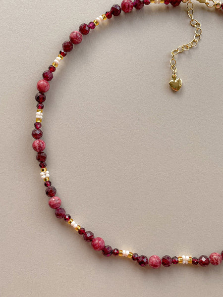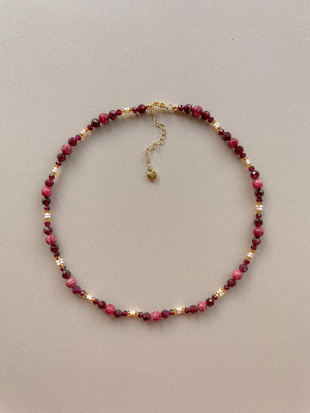 This necklace features garnet stones and white beaded accents to represent snowdrop flowers for the month of January