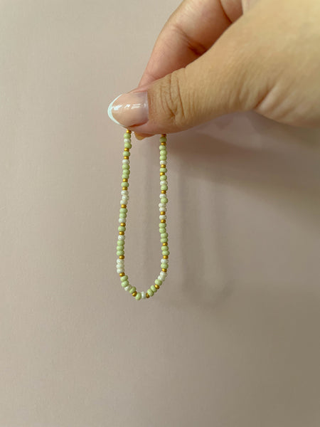 This bracelet features 24k matte gold plated 11/0 seed beads and light green and cream 8/0 seed beads.