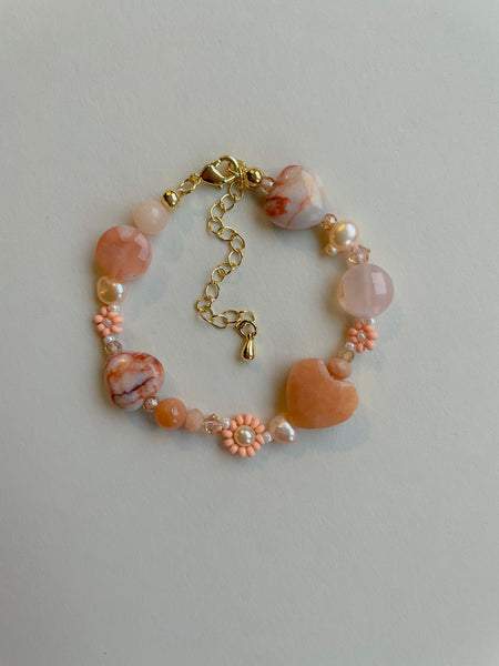 This bracelet features an assortment of peachy and creamy hues. It is carefully hand beaded with genuine gemstones, high quality seed beads and glass crystals.