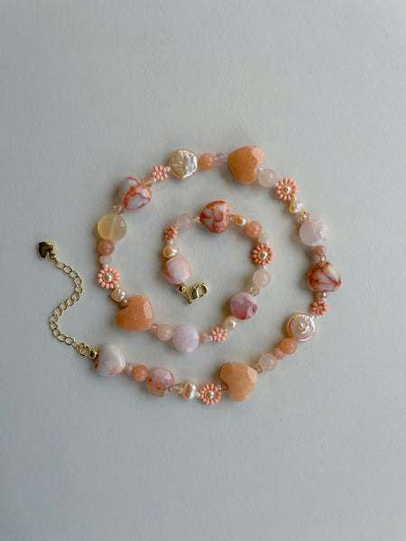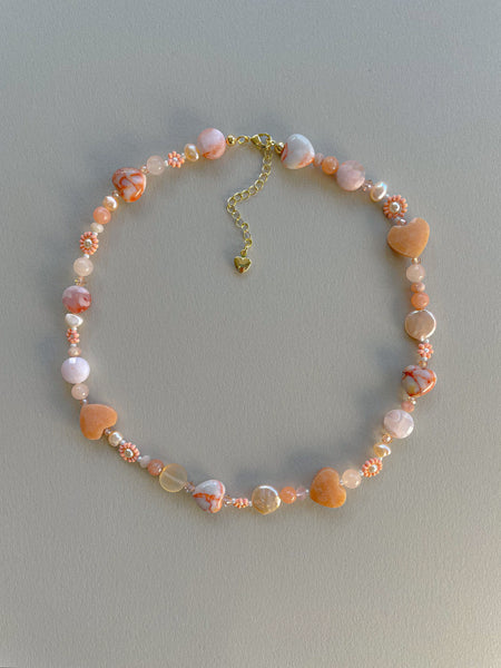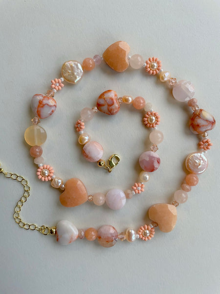Gemstones: Off white freshwater pearls, cherry blossom agate, peach calcite, peach sunstone, red web jasper, beige cubic zirconia, orange jade