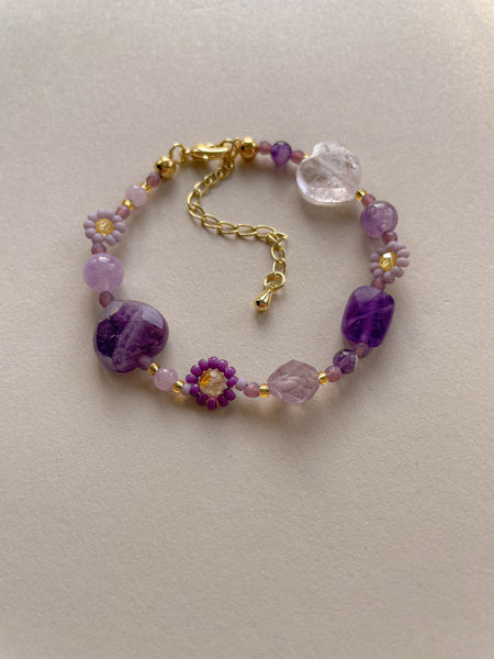 This bracelet features amethyst stones and purple beaded flowers to represent violet flowers for the month of February