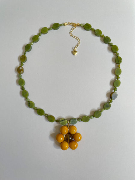 This chunky necklace features a handmade sunflower pendant featuring mookaite and smoky quartz and two different cuts of green jade.