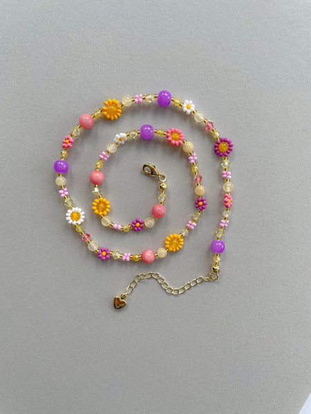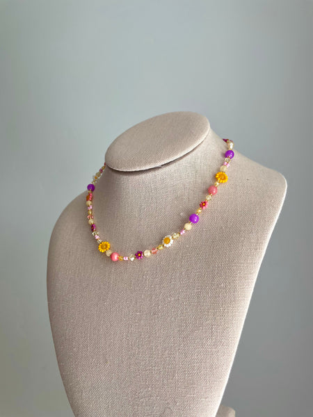 This necklace features bright spring colors. With handwoven yellow, purple, pink, and white flowers.